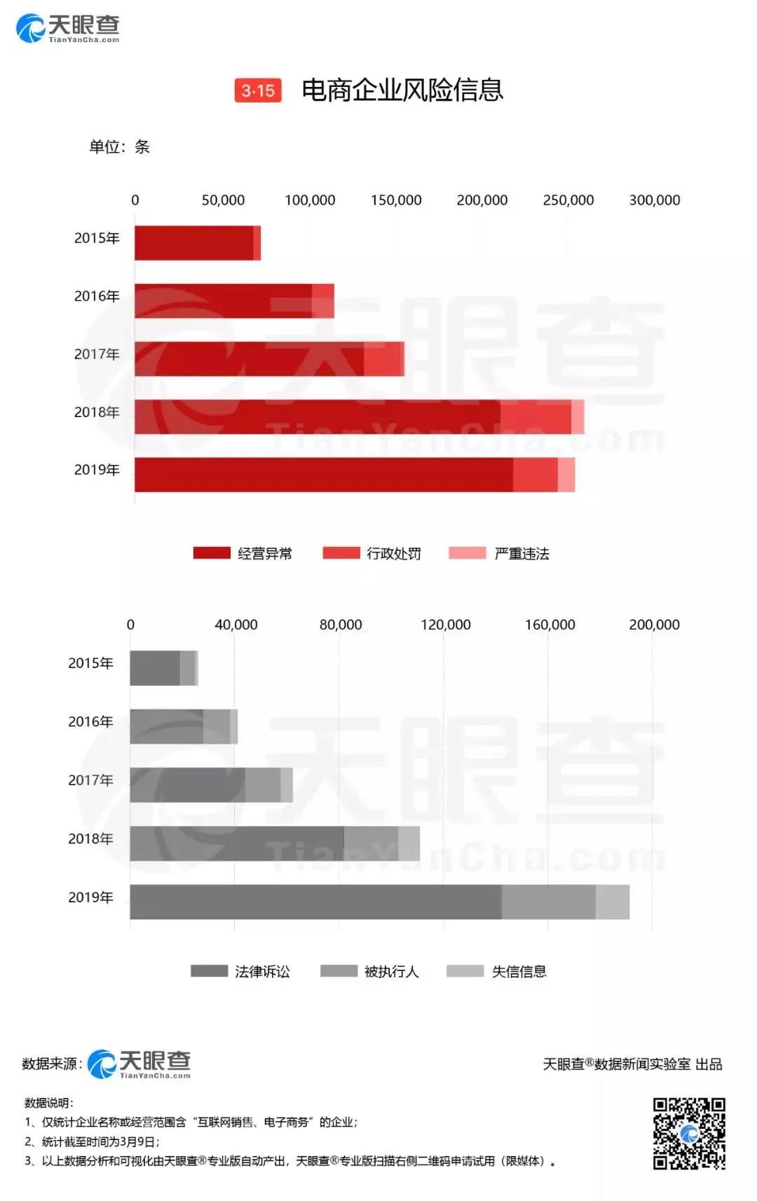 經(jīng)營(yíng)風(fēng)險(xiǎn)方面,天眼查專業(yè)版數(shù)據(jù)顯示,電商企業(yè)近5年累計(jì)產(chǎn)生超73萬(wàn)次經(jīng)營(yíng)異常,2019年就有20萬(wàn)次,占比近30%;而電商企業(yè)的行政處罰數(shù)量也從2015年起開(kāi)始翻倍增長(zhǎng),直到2019年新增數(shù)量才有所回落。