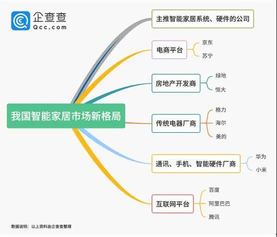 不過,目前中國(guó)智能家居市場(chǎng)正在形成新的格局,企查查整理了部分涉足智能家居的品牌,大致分布在這六大陣營(yíng):主推智能家居概念的智能家居系統(tǒng)和智能家居硬件初創(chuàng)公司陣營(yíng);以格力、海爾、美的等為代表的傳統(tǒng)電器廠商陣營(yíng);以華為、小米等為代表的通訊、手機(jī)、智能硬件廠商陣營(yíng);以BAT為代表的互聯(lián)網(wǎng)平臺(tái)陣營(yíng);以京東、蘇寧等為代表的電商平臺(tái);以綠地、恒大為代表的房地產(chǎn)開發(fā)商。