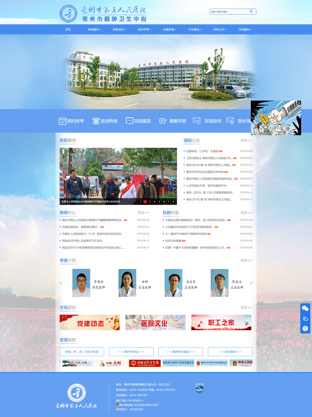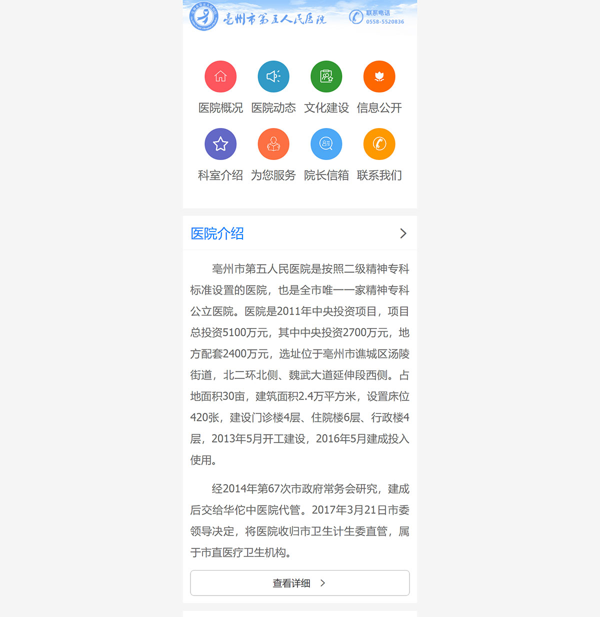 亳州市第五人民醫(yī)院是按照二級精神??茦藴试O(shè)置的醫(yī)院,也是全市唯一一家精神??乒⑨t(yī)院。醫(yī)院是2011年中央投資項目,項目總投資5100萬元,其中中央投資2700萬元,地方配套2400萬元,選址位于亳州市譙城區(qū)湯陵街道,北一環(huán)北側(cè)、魏武大道延伸段西側(cè)。占地面積30畝,建筑面積2.4萬平方米,設(shè)置床位420張,建設(shè)門診樓4層、住院樓6層、行政樓4層,2013年5月開工建設(shè),2016年5月建成投入使用。